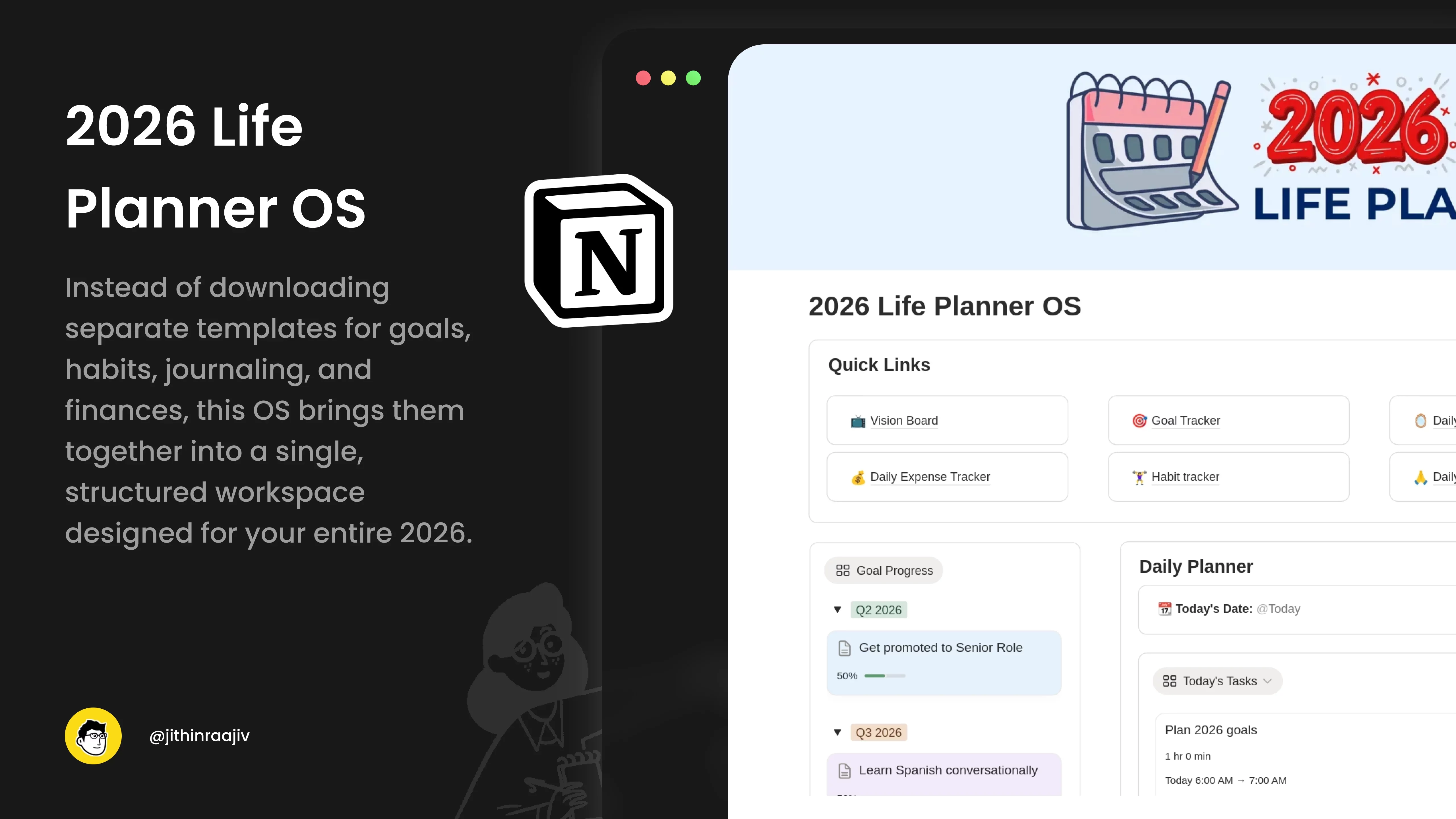 Plan your year, track habits, manage expenses, and reflect daily in one powerful 2026 Notion Life Planner OS.
