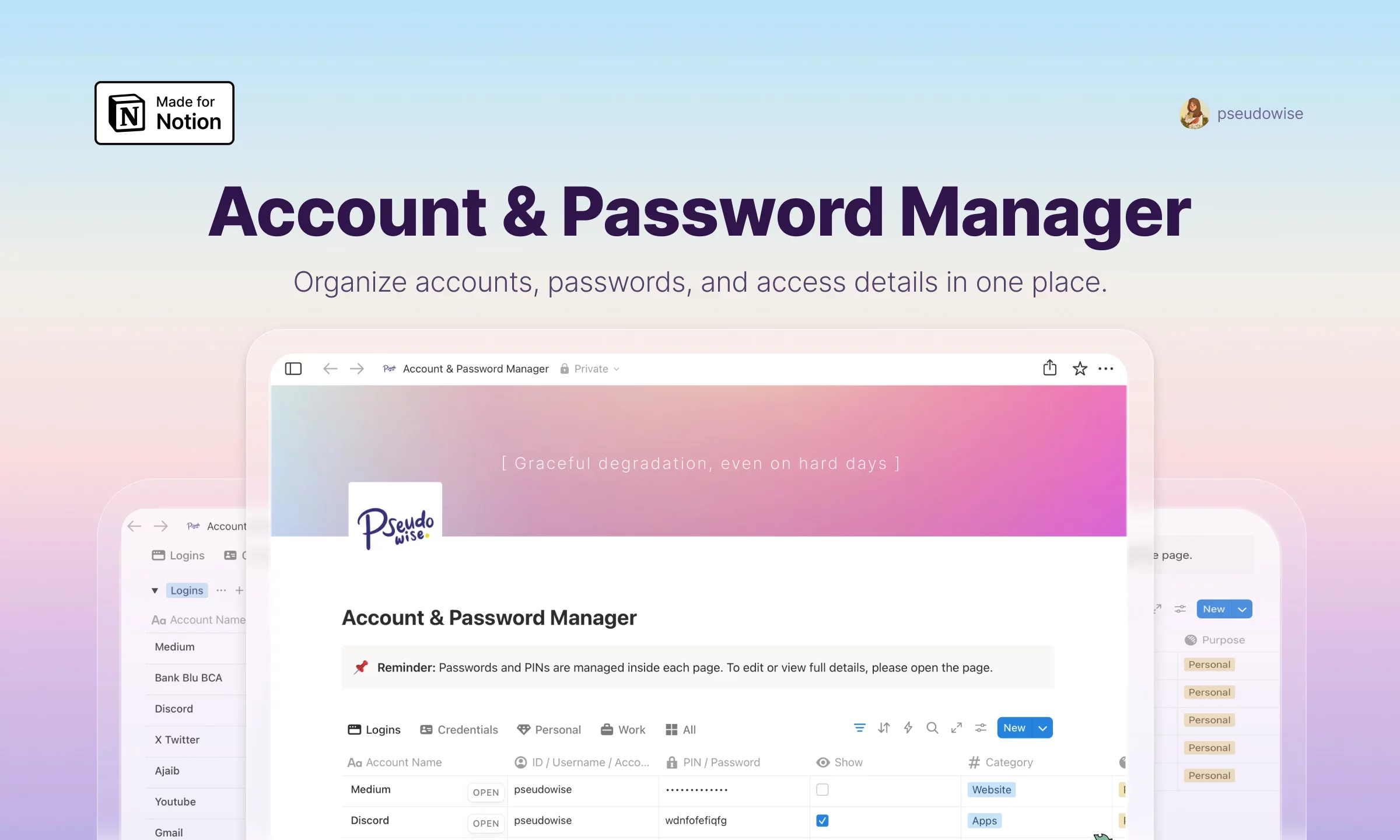 Get it now for 5A simple Notion template for managing accounts and credentials, designed for everyday use.
