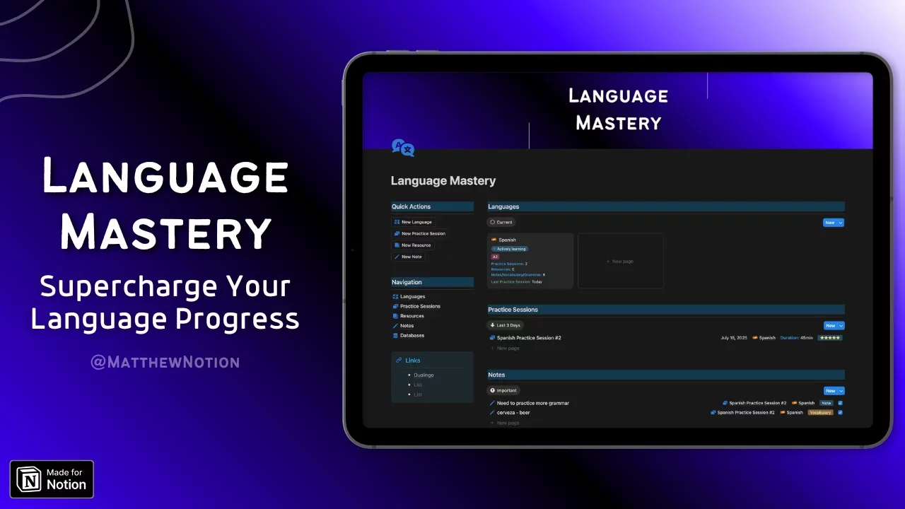 🔹 Language Mastery Notion template where you can organize your languages, practice sessions, resources, vocabulary, grammar and notes and store everything in one place