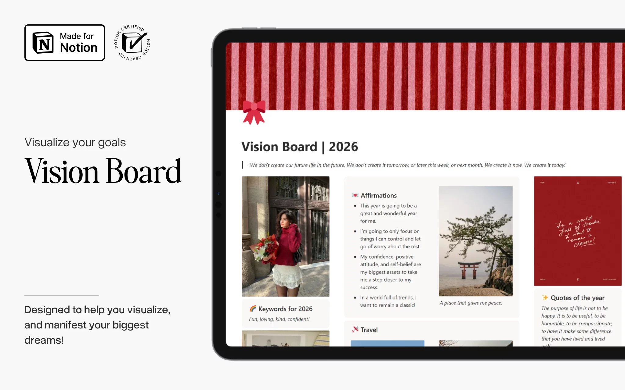 Designed to help you visualize, and manifest your biggest dreams. This template allows you to curate your aspirations, set clear intentions, and design a space that inspires daily focus.